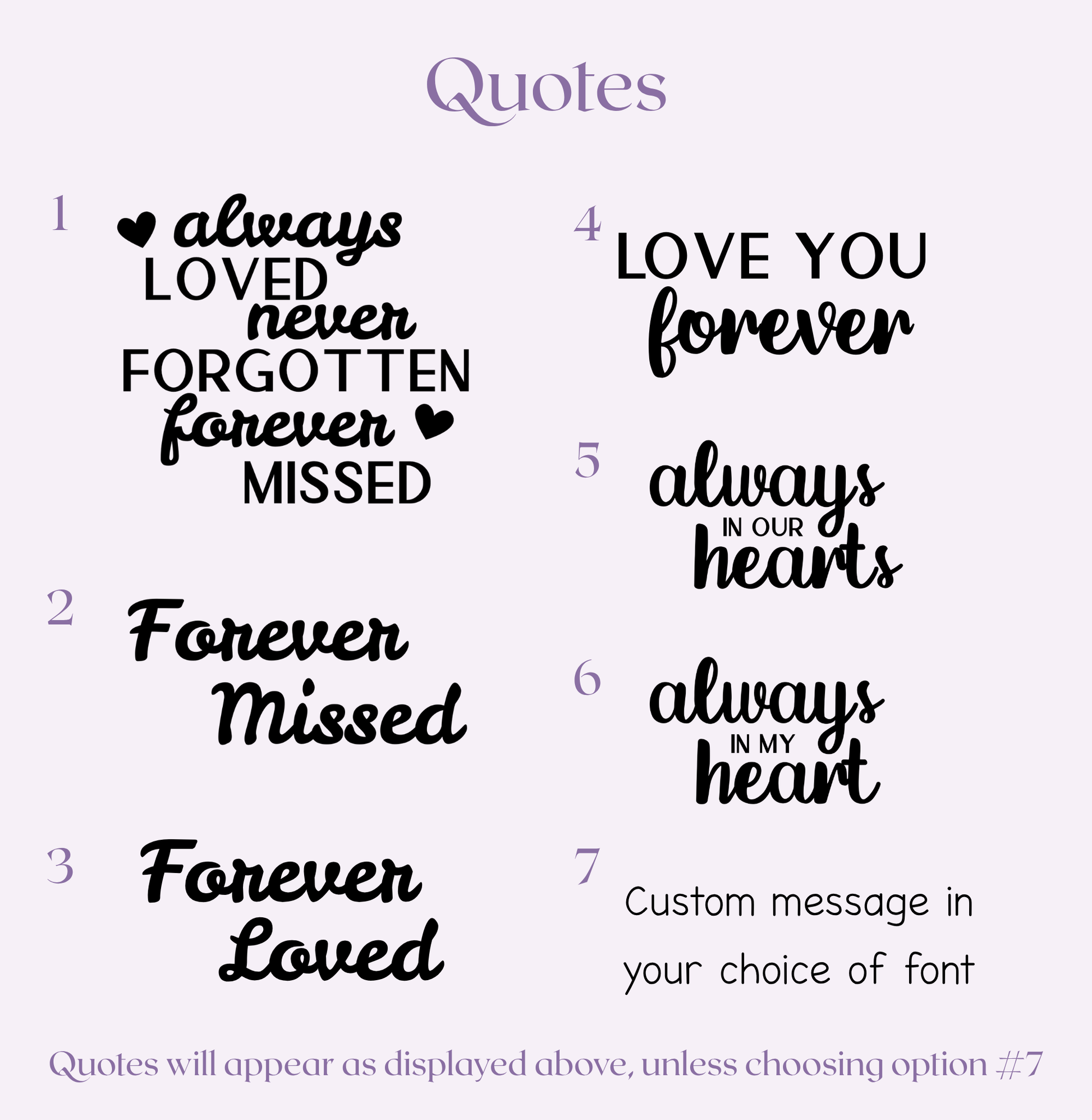Note: If purchasing the Name + Quote option with a decal, the decal may be added to the back if there is insufficient space on the front.