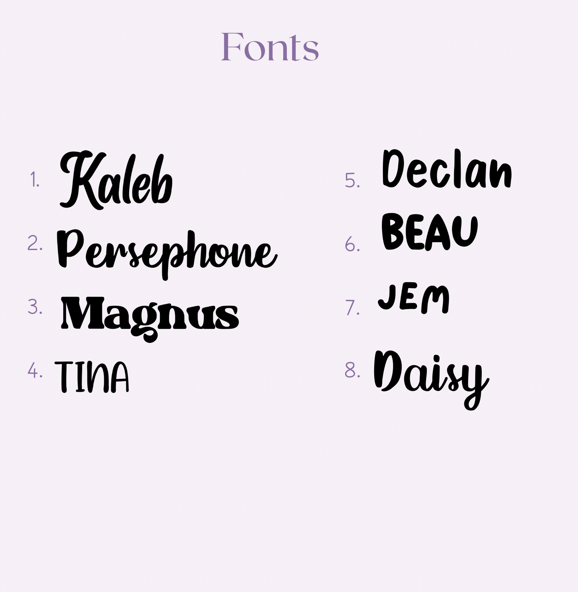 1) Your pet’s name; 2) Name font; 3) Name vinyl colour; 4) Charm; 5) Decal (if applicable); 6) Decal vinyl colour (if applicable).